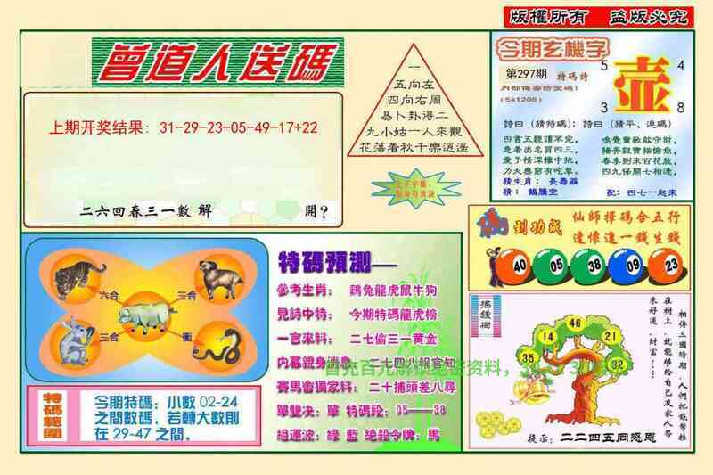 | 297期 | 猴马虎龙羊狗鸡 | 狗44准 |